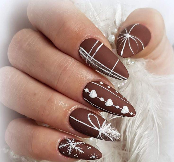 This design features a rich matte brown base decorated with crisp white lines, bows, hearts, and snowflakes, giving the nails a festive, wrapped-present feel. The overall look is cozy, elegant, and perfect for winter.