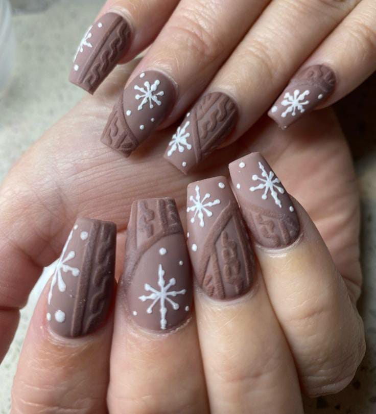 These nails combine a soft matte brown shade with sweater-texture patterns and white snowflakes for a warm, knitted-winter vibe. The raised detailing adds a cozy, tactile dimension.