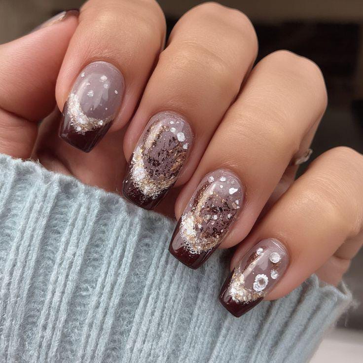 A glossy gradient of chocolate brown and nude is topped with scattered gold flakes and sparkles, creating a frosty, shimmering winter look. It feels soft, glam, and beautifully seasonal.