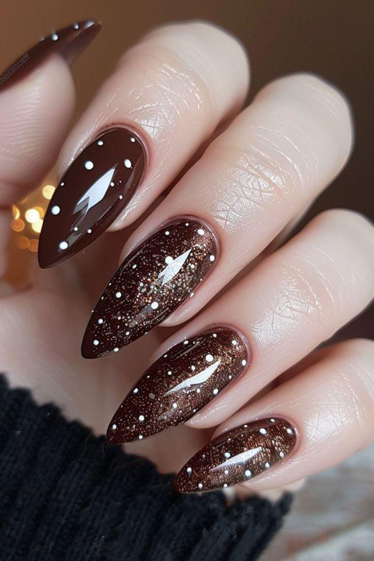 Deep glossy brown nails are sprinkled with white dots and subtle shimmer, creating a starry-night effect over a rich cocoa base. The look is sleek, bold, and wintery with a touch of magic.