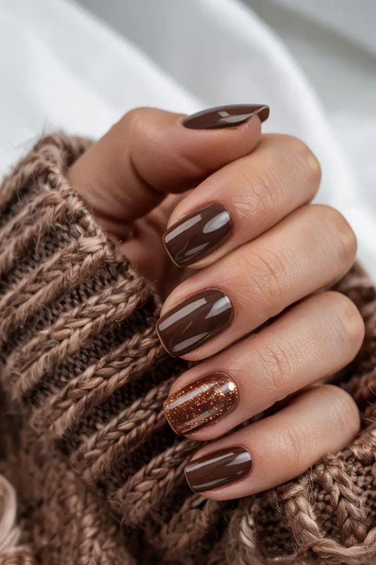 This design features rich chocolate-brown nails with a glossy finish, paired with a single accent nail in warm copper glitter and subtle striping for a cozy, sweater-weather vibe.