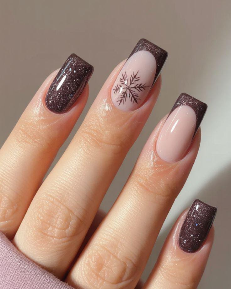A soft nude base is paired with deep brown glittery French tips, highlighted by a delicate snowflake accent that gives the whole look a wintry, elegant feel.