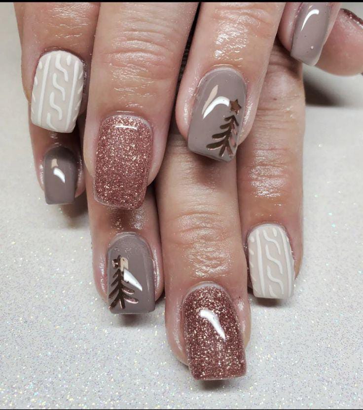 Muted taupe brown and cream tones mix with sweater-texture patterns and tiny brown tree designs, accented by rosy-brown glitter for a charming, rustic winter look.