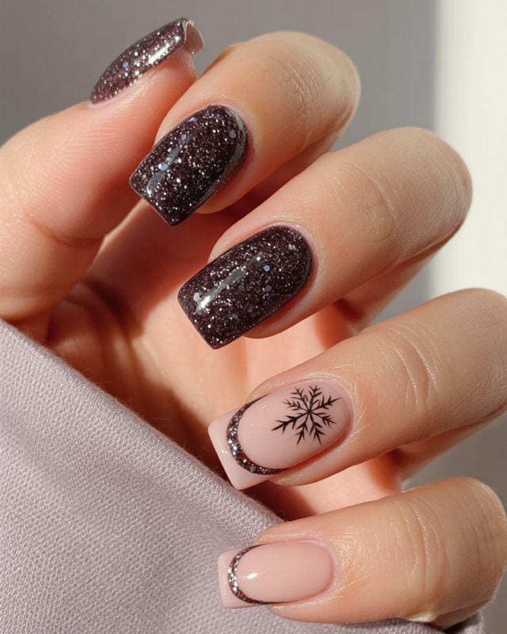 Dark brown glitter nails contrast beautifully with soft nude bases outlined by fine silver details, plus a bold black snowflake that adds a crisp, frosty touch.