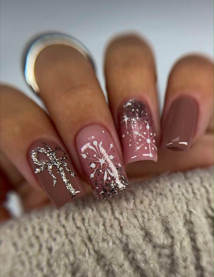 Soft mocha brown nails blend with silver glitter gradients and white snowflake patterns, creating a festive winter look that feels warm, sparkly, and seasonal.