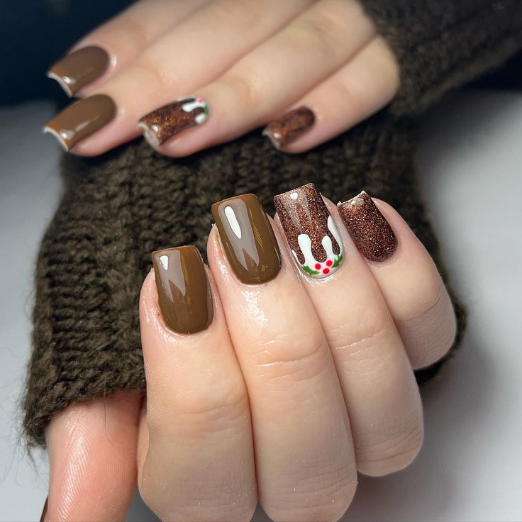 Warm brown nails blend with glittery bronze accents and a festive dripped-icing design, resembling gingerbread treats perfect for winter.