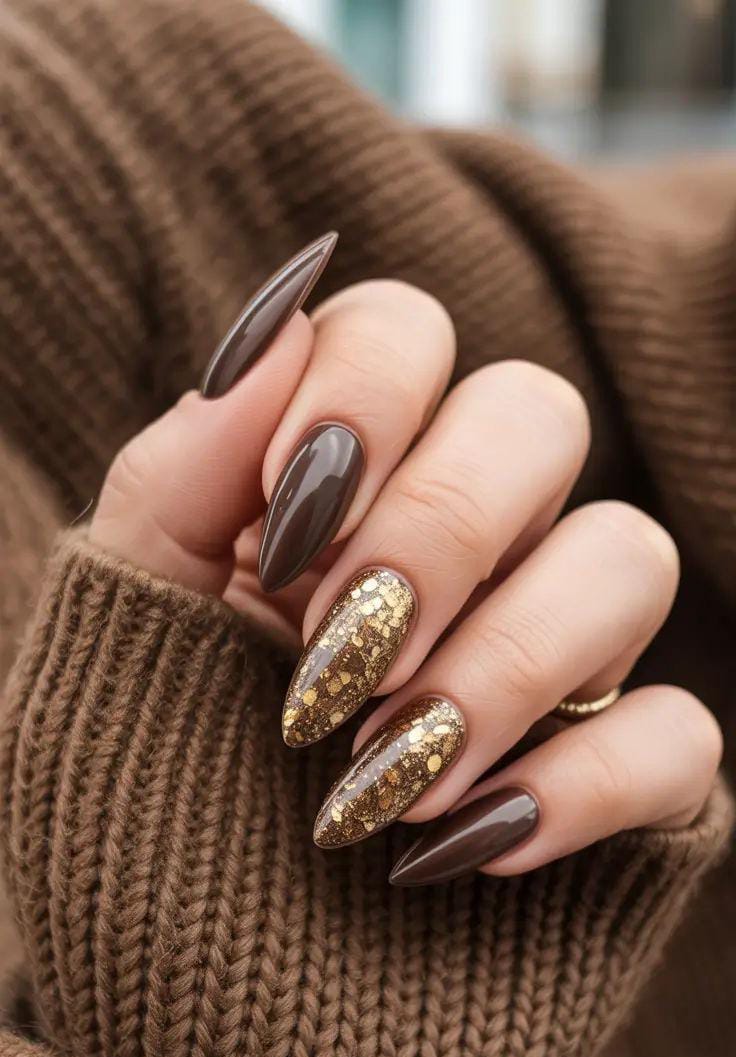 Deep brown almond nails are paired with chunky gold glitter accents that add rich warmth and holiday radiance. The glossy finish and gold tones create an elegant, cozy winter-glam vibe.