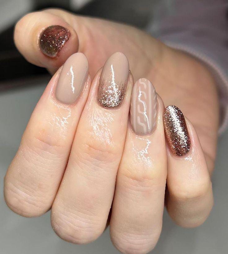 A soft beige brown base is elevated with rose-gold glitter fades and a subtle knit-pattern detail, giving the design a warm, elegant winter glow.