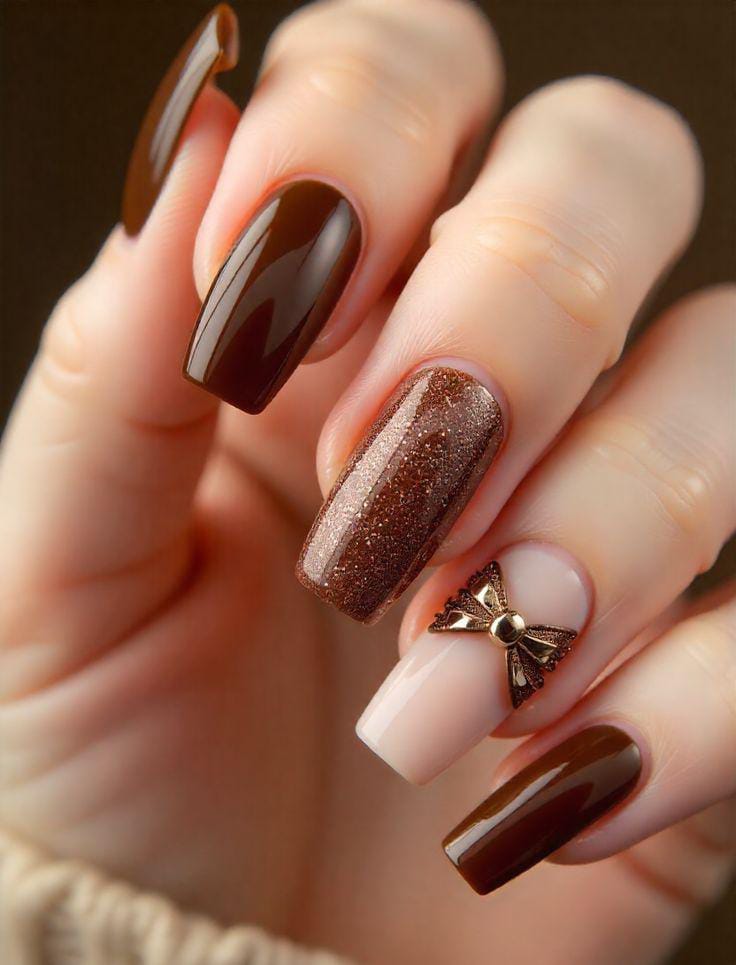 This design blends deep glossy browns with a glittery accent nail and a soft nude base, elevated by a small metallic bow charm for a rich, elegant winter look.
