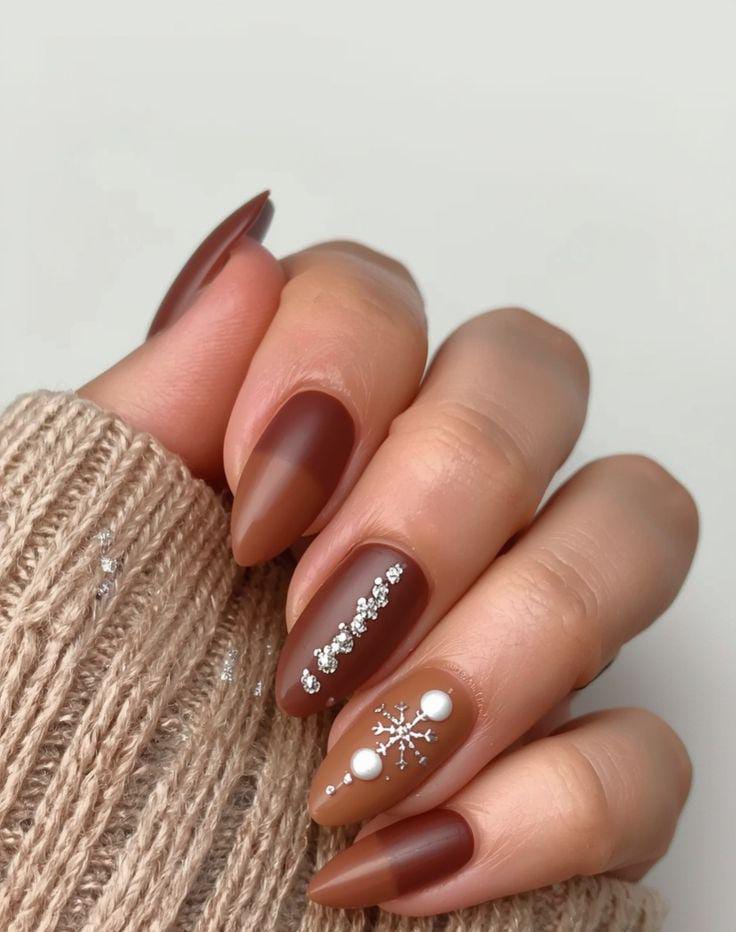 Matte brown tones pair beautifully with silver snowflake accents and tiny pearls, giving the nails a cozy yet festive cold-weather vibe.