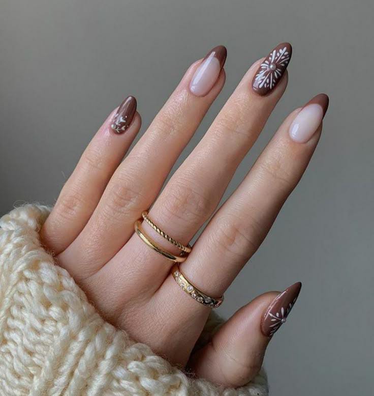 Soft nude bases meet dark brown tips and delicate white floral-snowflake patterns, creating a refined, wintry twist on the classic French look.
