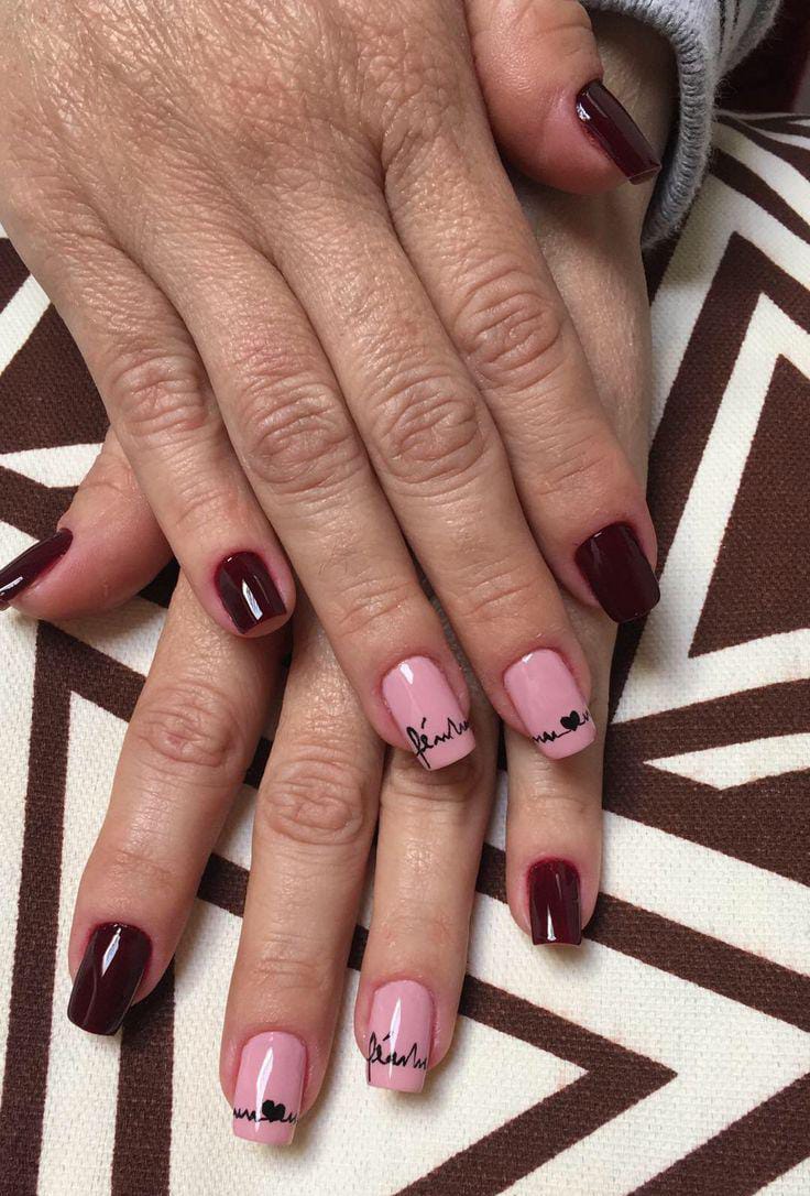 Dark burgundy nails are mixed with soft pink accents and simple heart details. The style feels warm, cozy, and gently romantic Valentines.