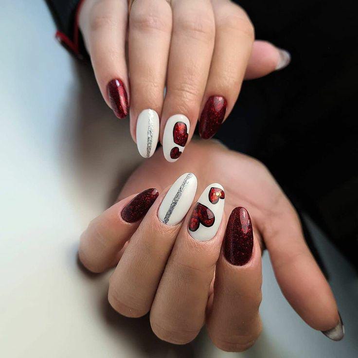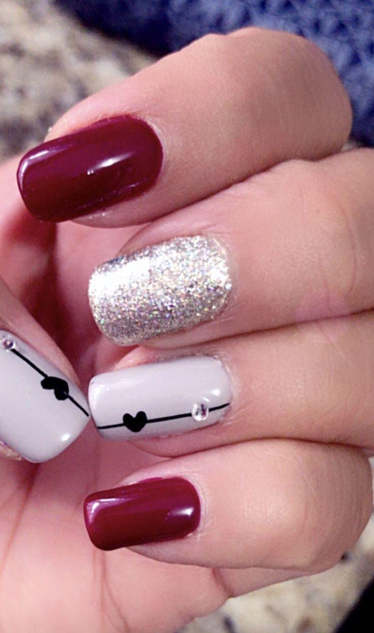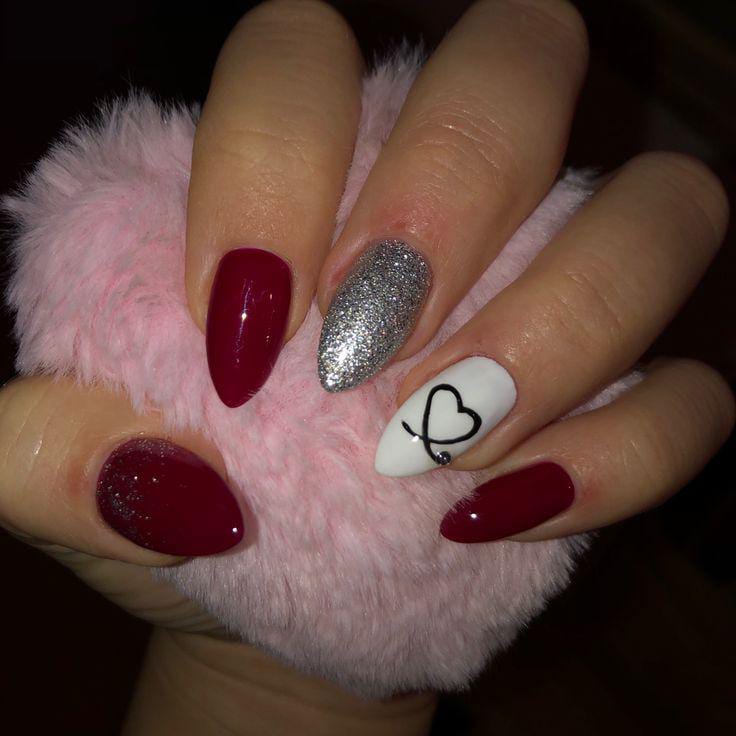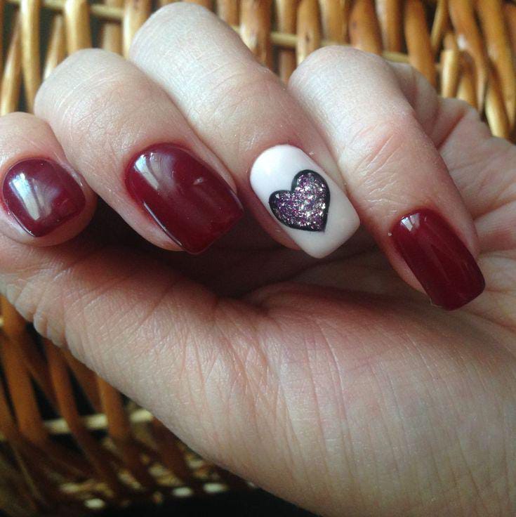 Classic burgundy nails are combined with a silver glitter accent and a white heart detail. The design balances sparkle and romance for a bold Valentine look.