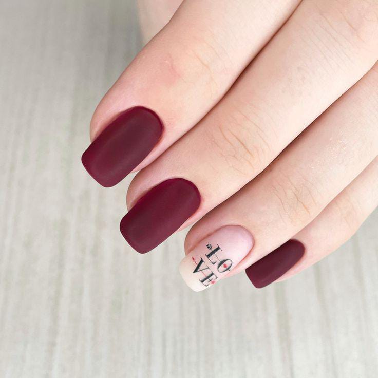 Rich burgundy matte nails are balanced with a single neutral accent nail and subtle “LOVE” text. The overall vibe is modern, chic, and understated Valentines.