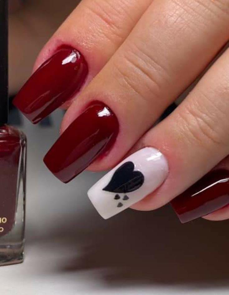 Glossy burgundy nails stand out with a white accent nail featuring a bold black heart. This design feels confident, elegant, and perfect for Valentine’s Day.