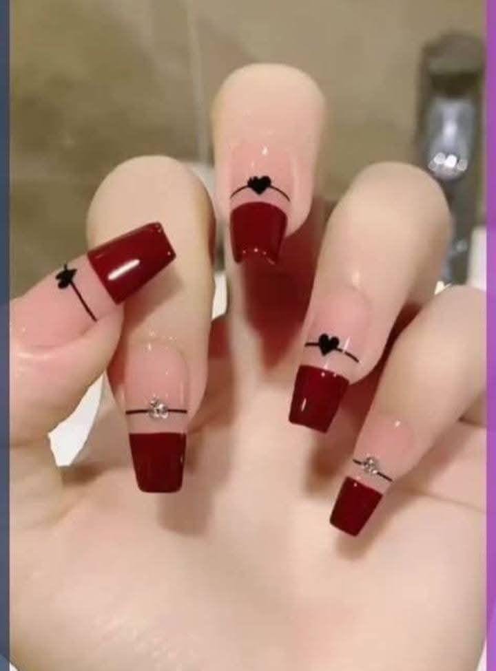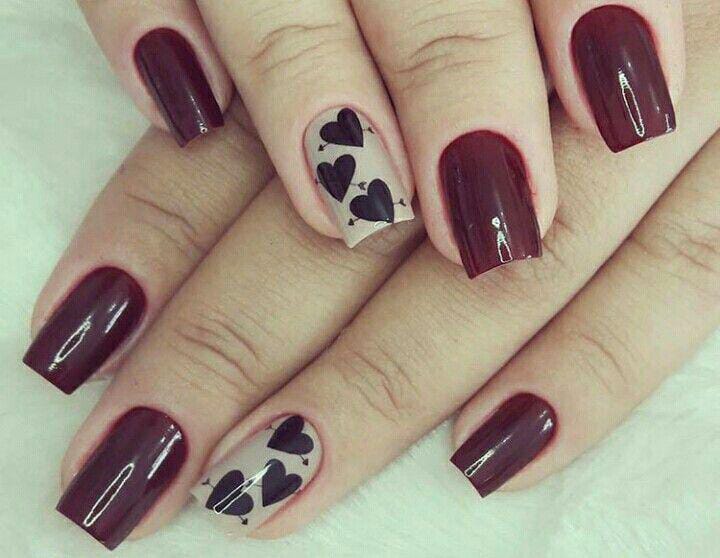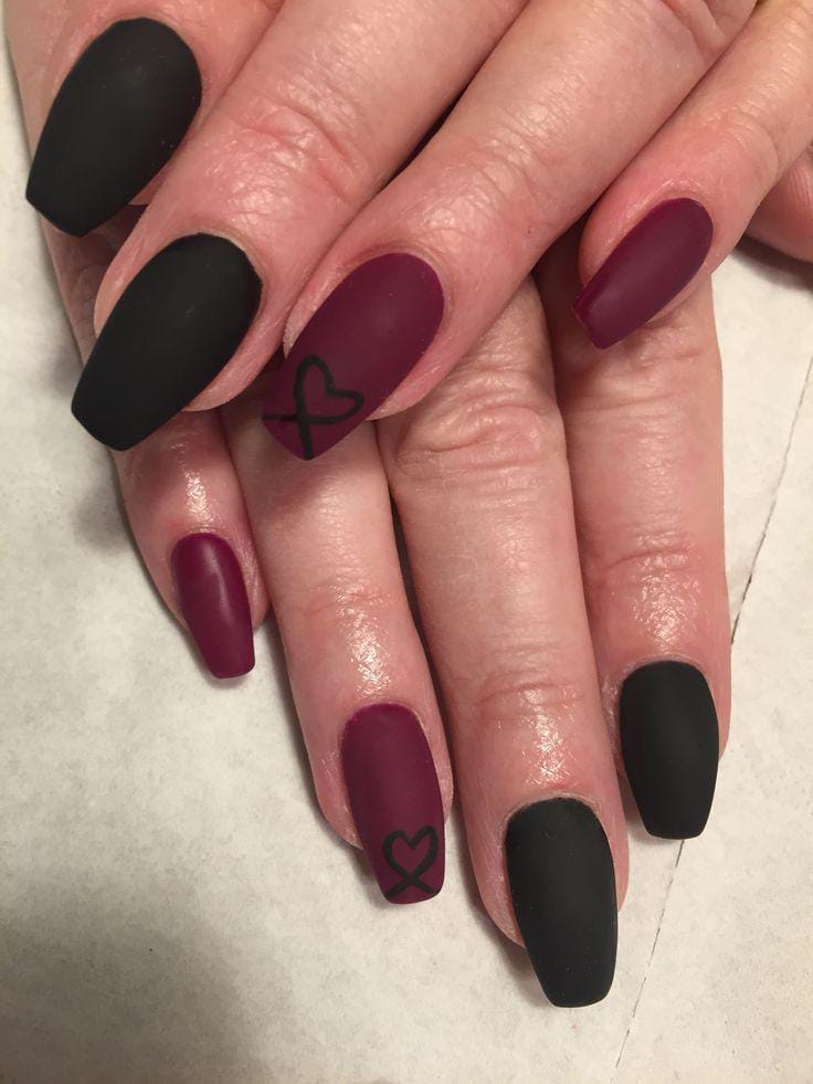 Matte burgundy and black nails create a bold contrast with minimalist heart line art. The style is edgy, modern, and effortlessly chic Valentines.