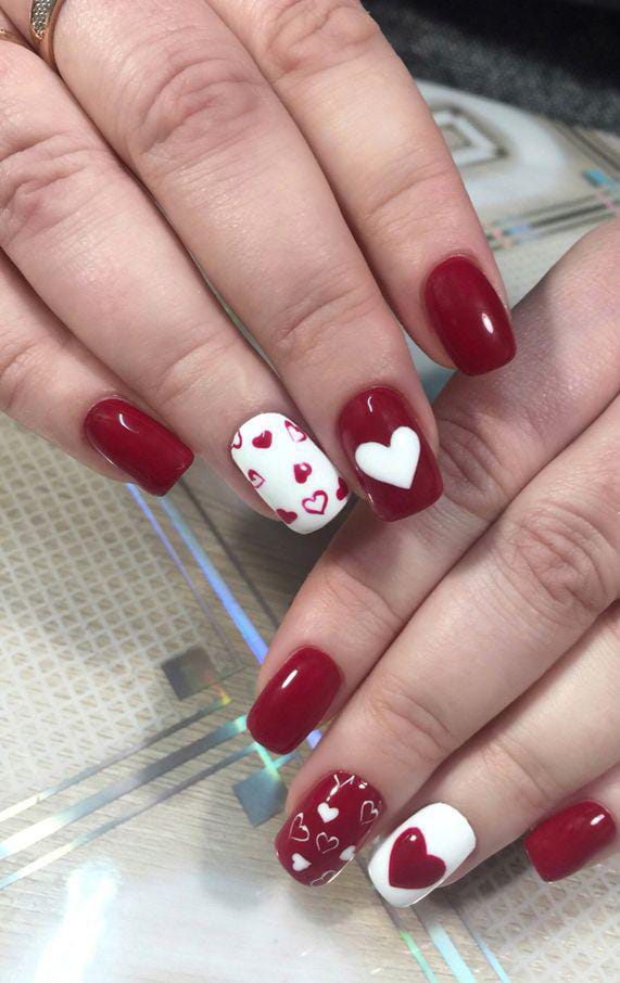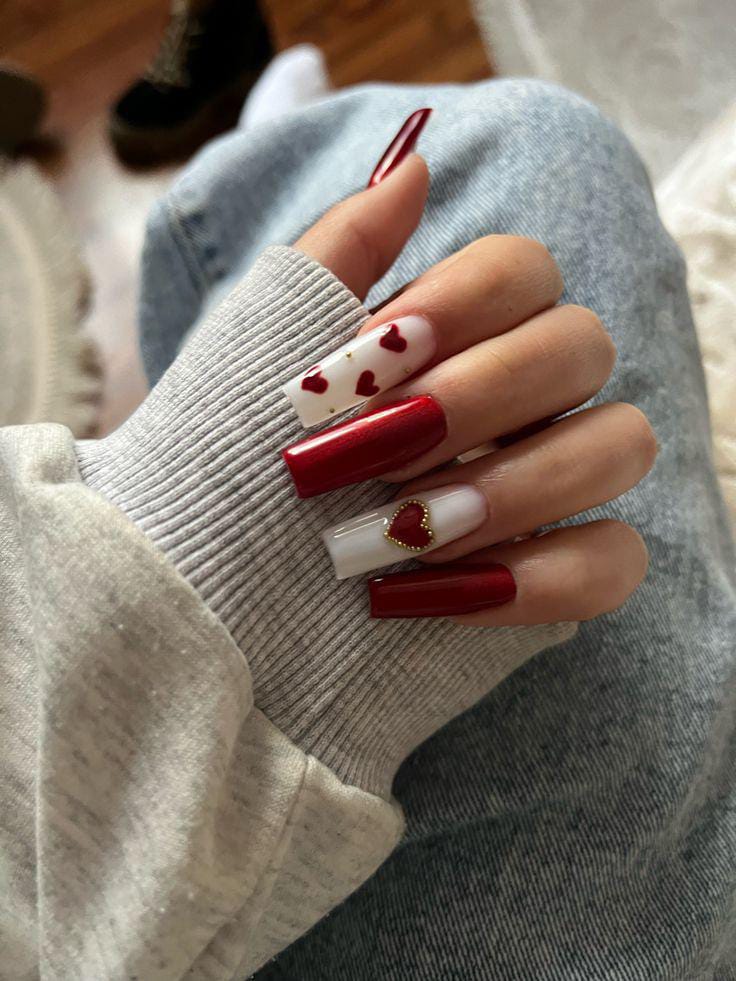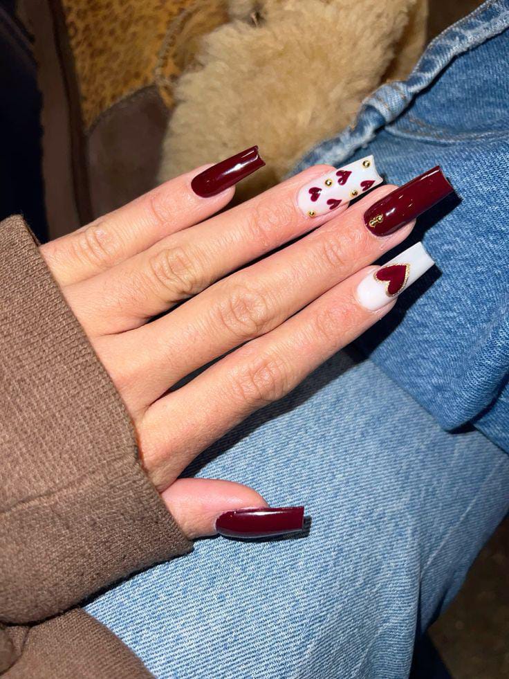 Deep red-burgundy nails are accented with white bases and heart details in red and gold. The style feels classic, romantic, and timeless for Valentine’s Day.
