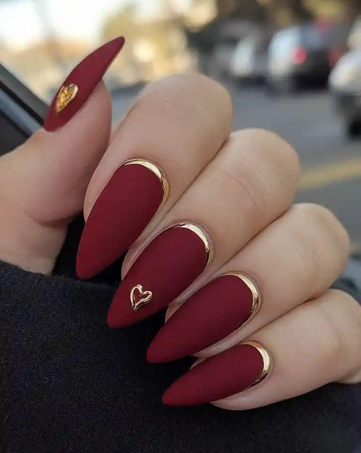 Matte burgundy stiletto nails are finished with delicate gold heart accents. This design feels luxurious, bold, and modern Valentine’s look.