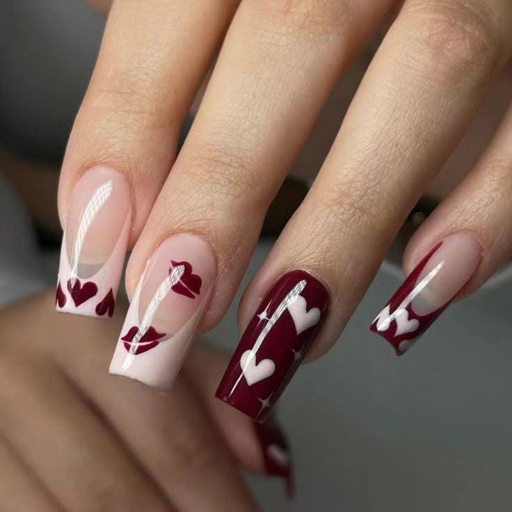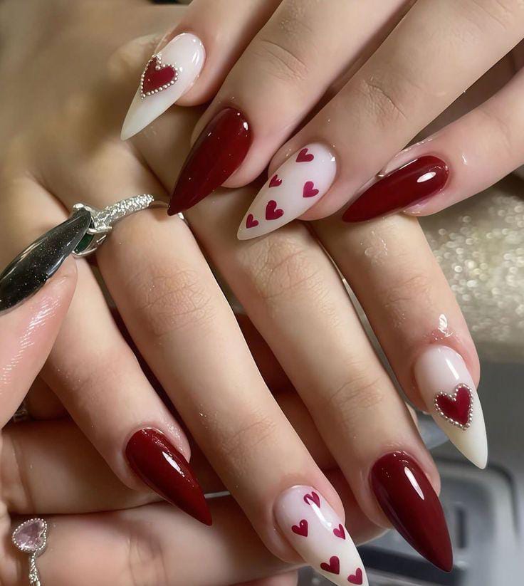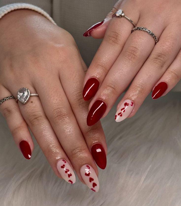 This style blends solid burgundy nails with nude accents decorated with small red hearts. The overall look feels playful yet classy, perfect for Valentine’s season.