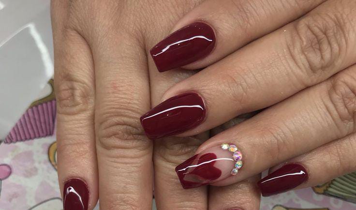 Glossy burgundy nails take center stage with a single accent nail decorated with subtle rhinestones. The overall vibe is elegant, polished, and perfect for Valentine’s glamour.