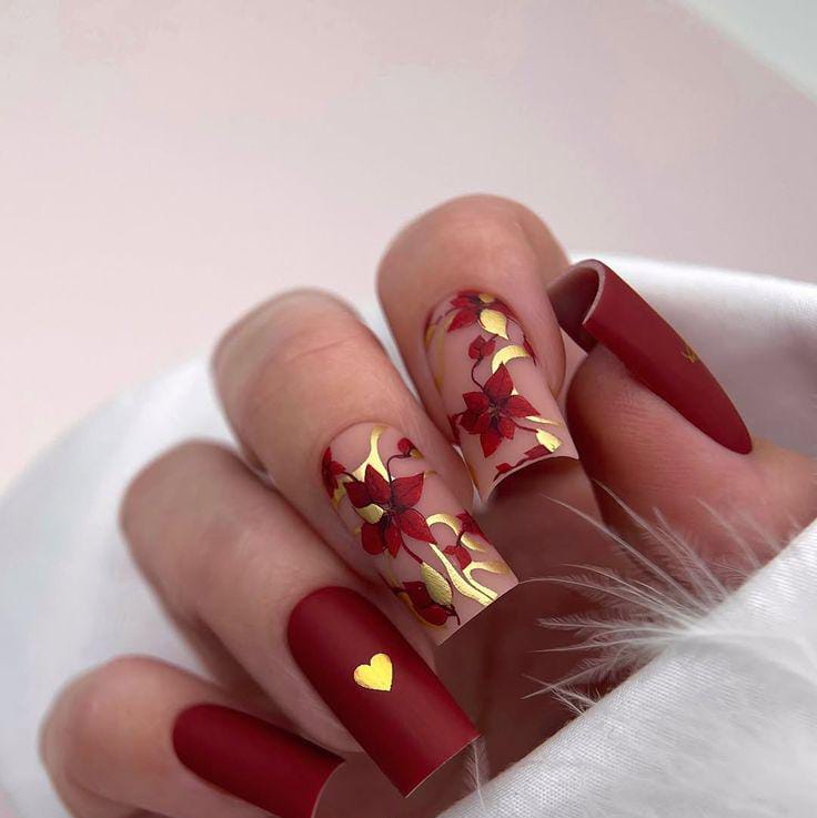 Deep burgundy nails with a small gold heart are paired with sheer nude accents featuring red florals and soft gold foil details. The overall look feels romantic, elegant, and perfect for Valentine’s season.
