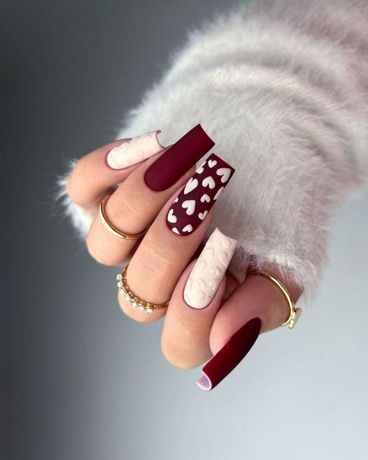 Rich burgundy matte nails are mixed with blush-toned accents and tiny heart patterns. The design gives a warm, cozy, and playful Valentine’s vibe.
