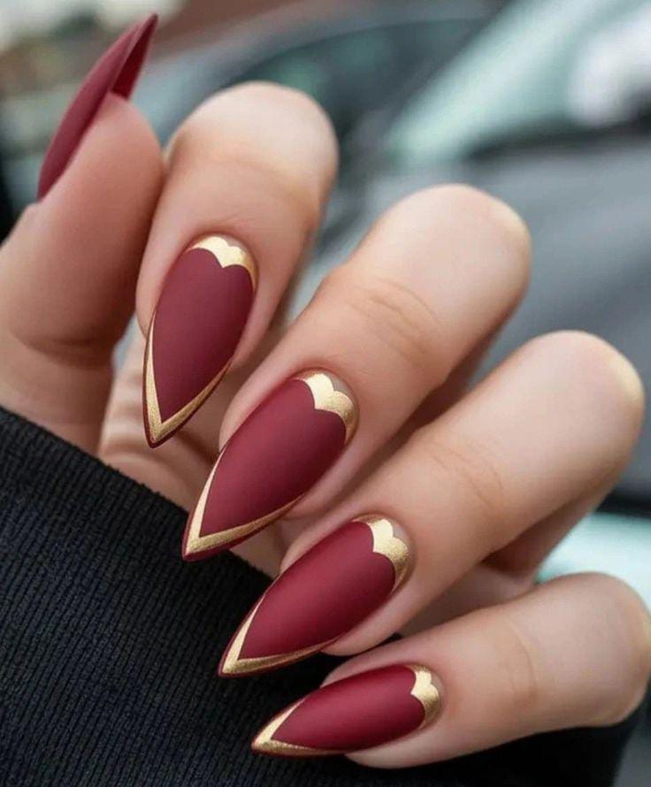 Matte burgundy stiletto nails are outlined with delicate heart-style gold edging for a sleek finish. This design feels bold, classy, and modern Valentines with a romantic touch.