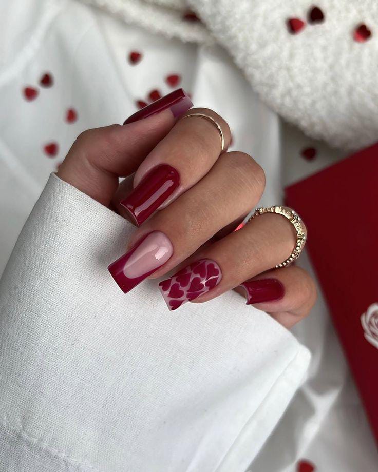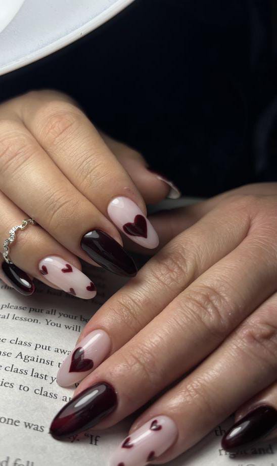 Deep burgundy and soft blush nails are decorated with scattered heart shapes. The look is bold yet elegant, with a cozy Valentine mood.