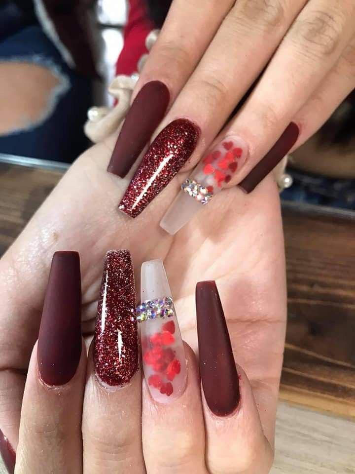 This design mixes deep burgundy matte nails with rich glitter accents for a bold Valentine vibe. Clear nails with red heart details add a romantic, eye-catching touch.