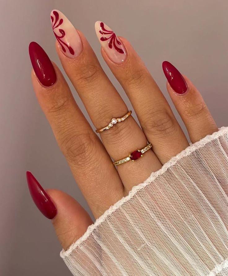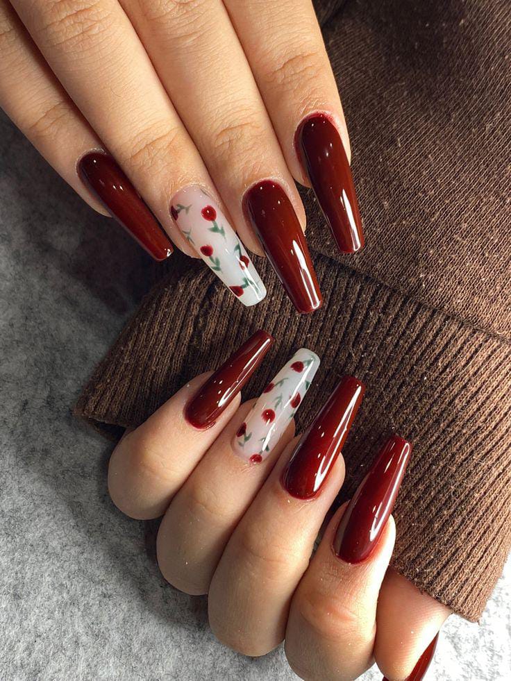 Glossy burgundy nails are paired with soft nude accents decorated with tiny cherry-like florals. The overall look feels elegant, warm, and subtly romantic Valentines.