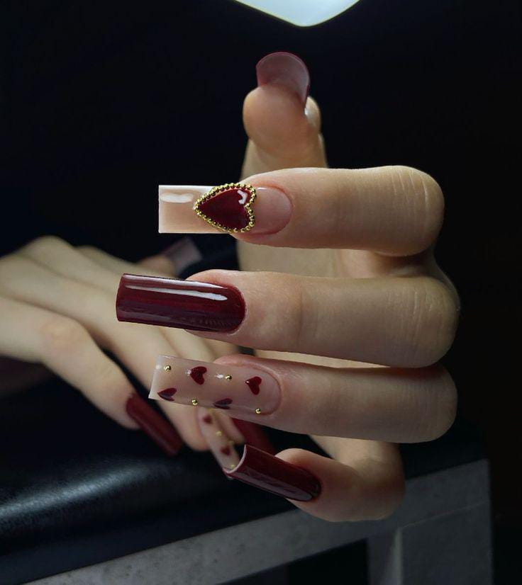This set blends deep wine burgundy shades with sheer nude nails featuring heart designs and small gold details. It has a luxurious, dramatic Valentine’s feel.