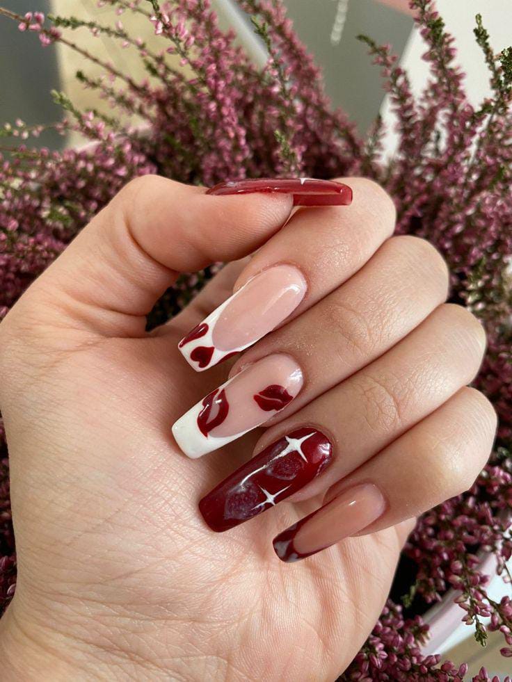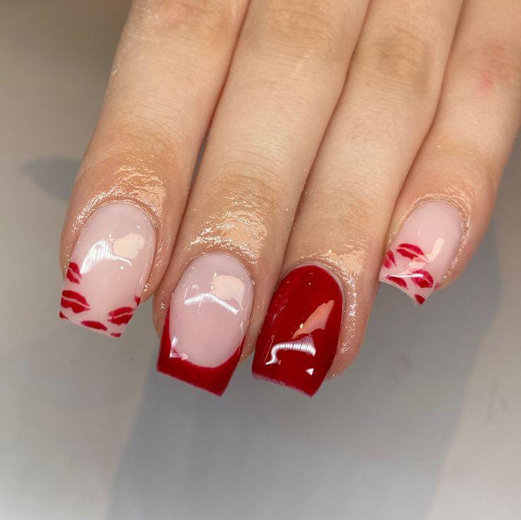 Nude bases are combined with burgundy French tips and kiss-print accents. The design feels playful, flirty, and perfect for Valentine’s season.