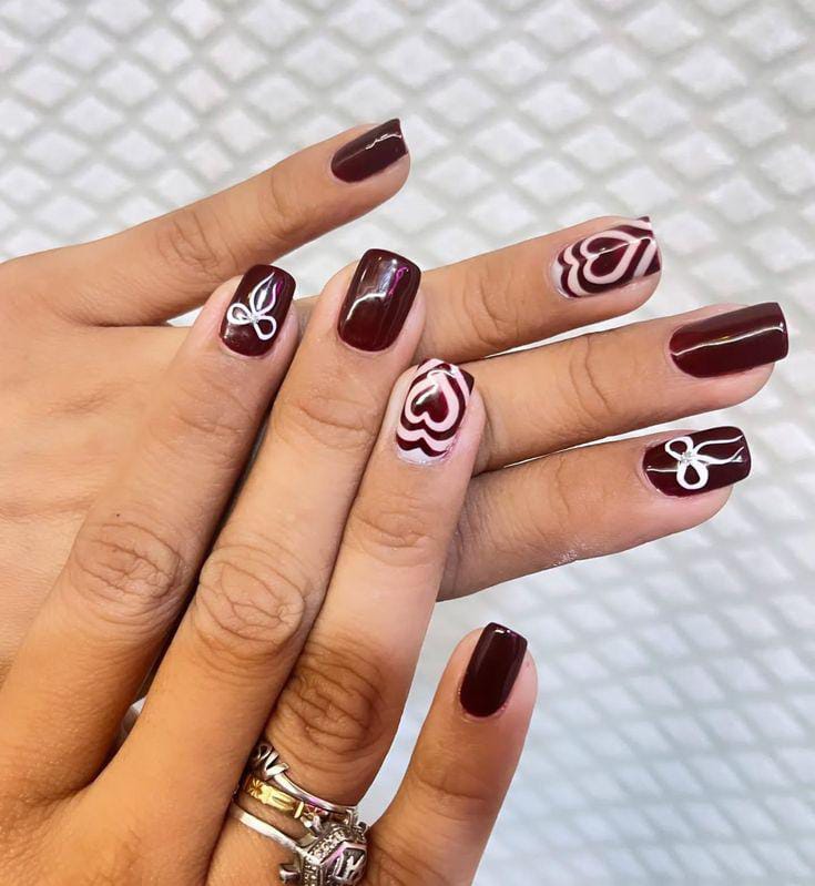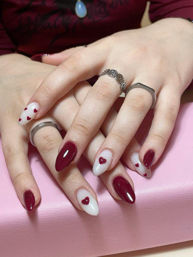 Deep burgundy nails are paired with white accent nails featuring small heart patterns. The look feels playful, romantic, and perfect for Valentine’s Day.