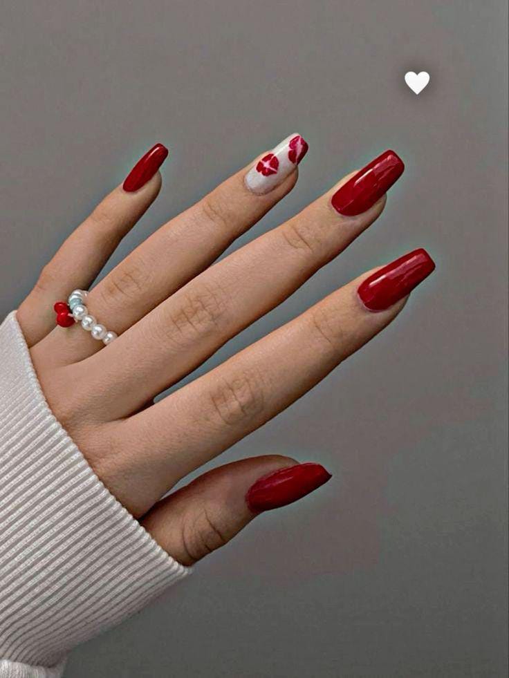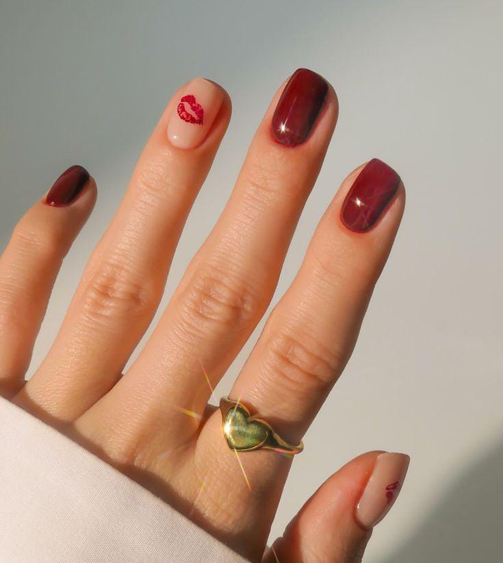 Shiny burgundy nails are balanced with a single nude nail decorated with a red kiss detail. The vibe is simple, chic, and subtly flirty Valentine’s look.