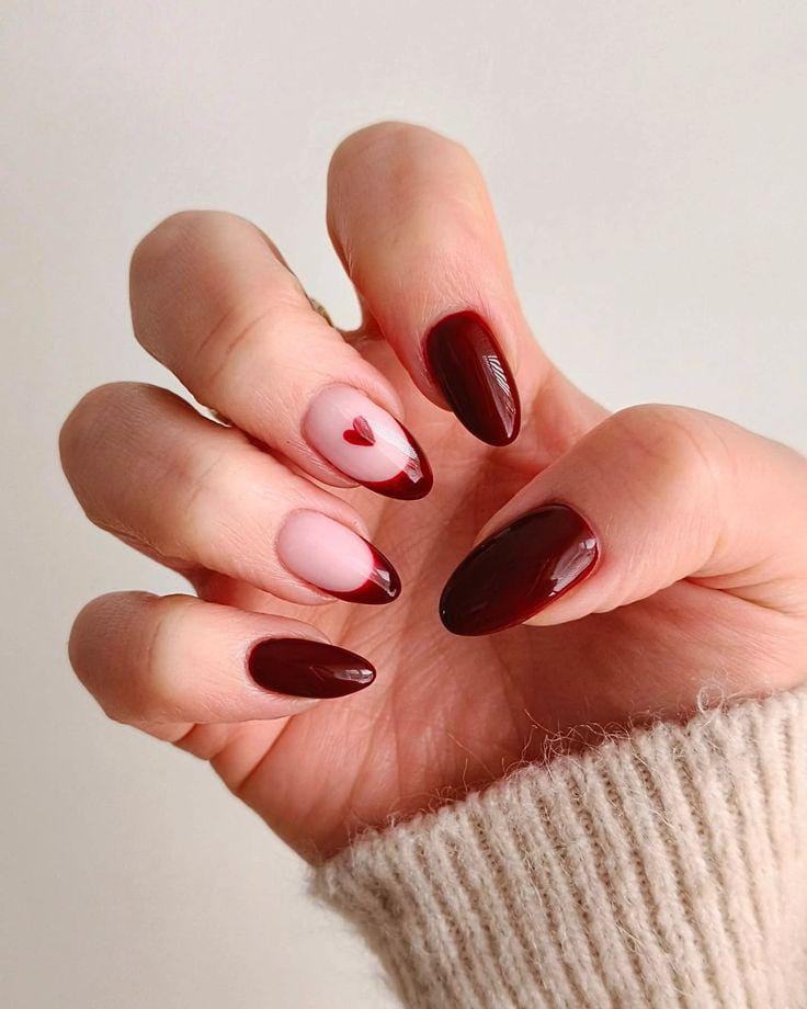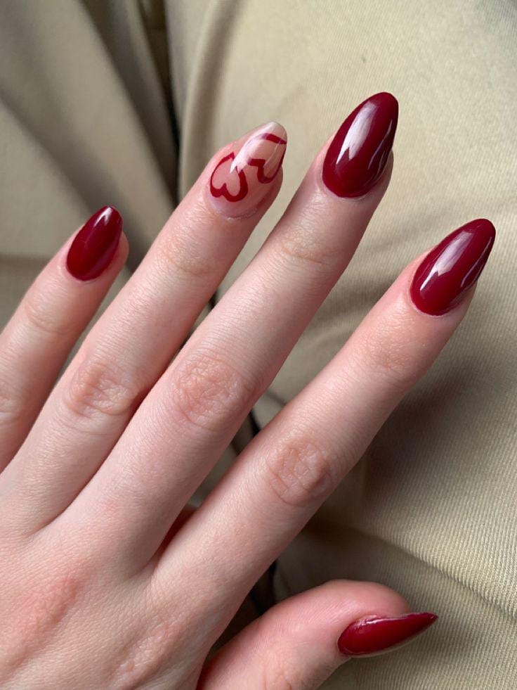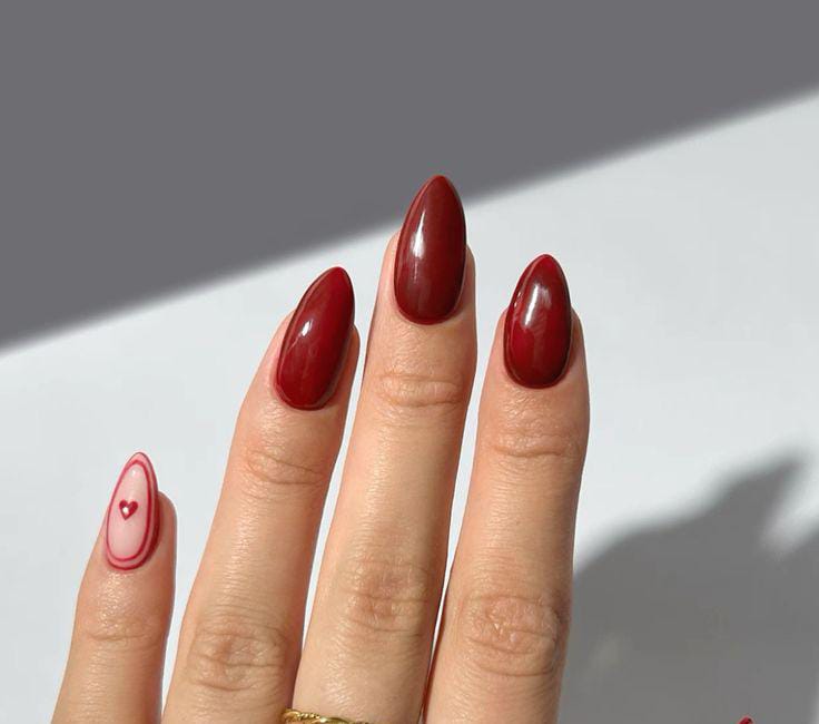 Deep burgundy almond nails are paired with a soft nude accent featuring a tiny red heart. The look is simple, glossy, and subtly romantic Valentines.