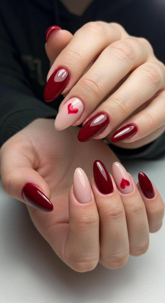 Glossy burgundy nails are combined with soft nude bases and subtle heart designs. The look is clean, sweet, and effortlessly Valentine-inspired