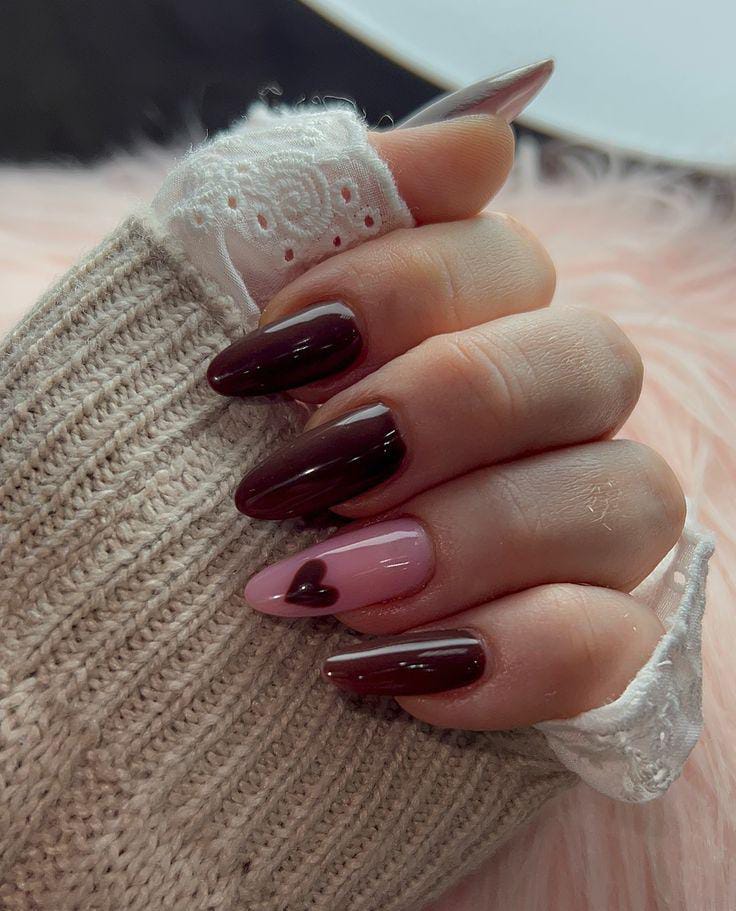 Dark burgundy nails are balanced with a muted pink accent featuring a single heart. The overall vibe is warm, cozy, and softly romantic Valentines.