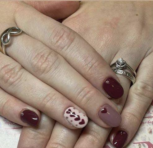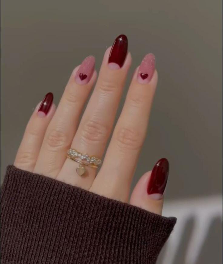 Burgundy nails are mixed with pink, slightly glittery accents finished with small heart details. The style feels sweet, feminine, and festive Valentine’s vibe.