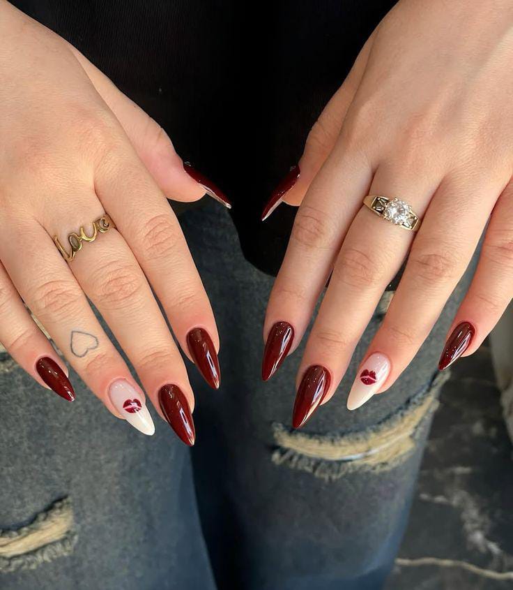 A rich burgundy palette is combined with soft white accent nails featuring small kiss-print details. The overall style is bold, flirty Valentines, and slightly edgy while staying romantic.