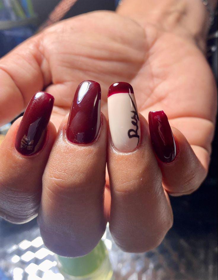 Glossy burgundy nails are mixed with a creamy accent nail featuring handwritten-style lettering. The overall vibe is personal, chic, and Valentine-inspired.