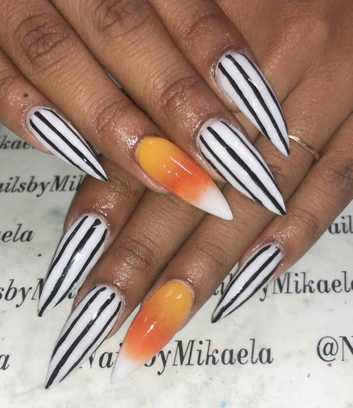 Sharp, stiletto nails featuring bold candy corn stripes with stitched detailing, paired with matte black and glitter for a darker twist.