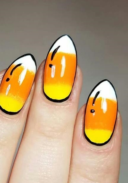 Glossy candy corn nails outlined in black for a cartoon-like effect, making them pop with playful energy.