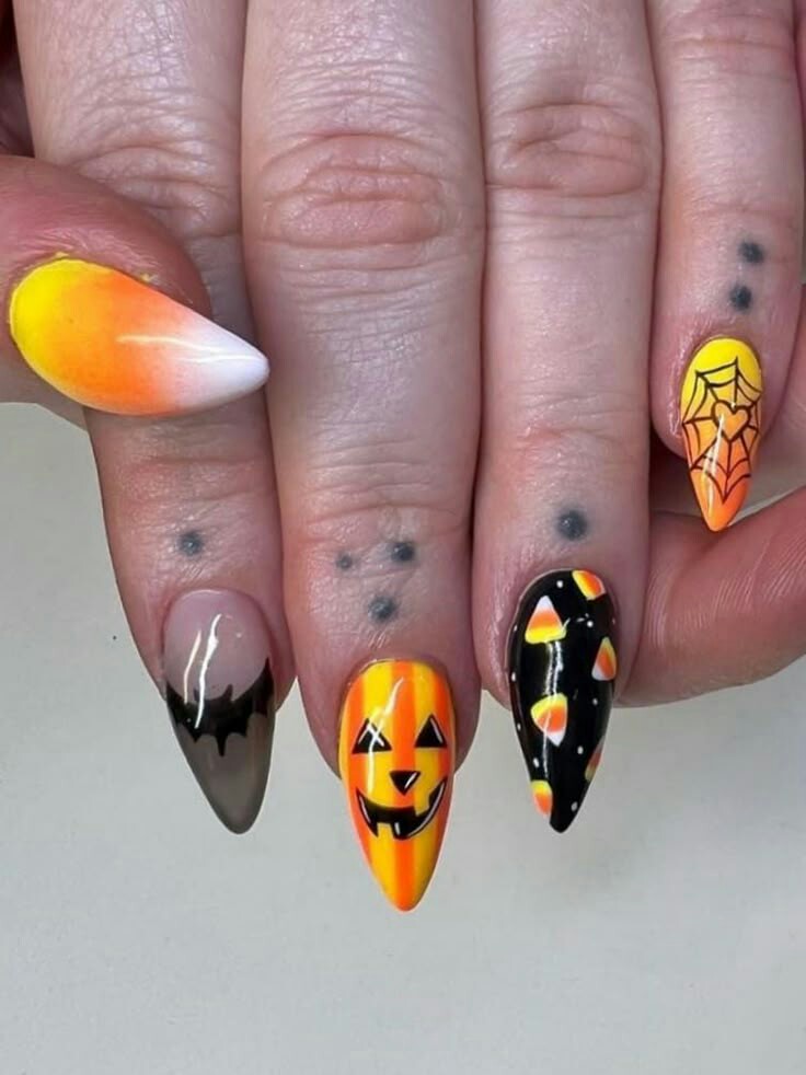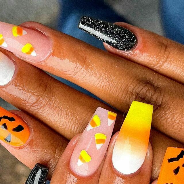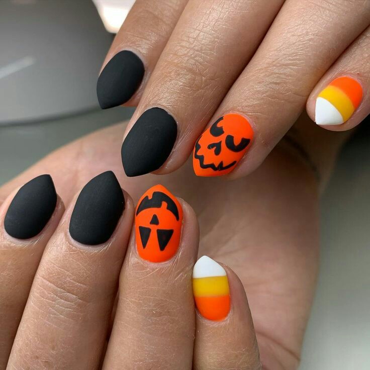 A mix of matte black nails, pumpkin faces, and candy corn stripes creates a playful yet spooky vibe.