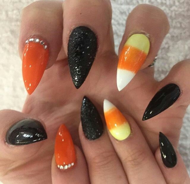 A glossy mix of black sparkle, orange shine, and striped candy corn nails with a touch of rhinestone accents for extra flair.