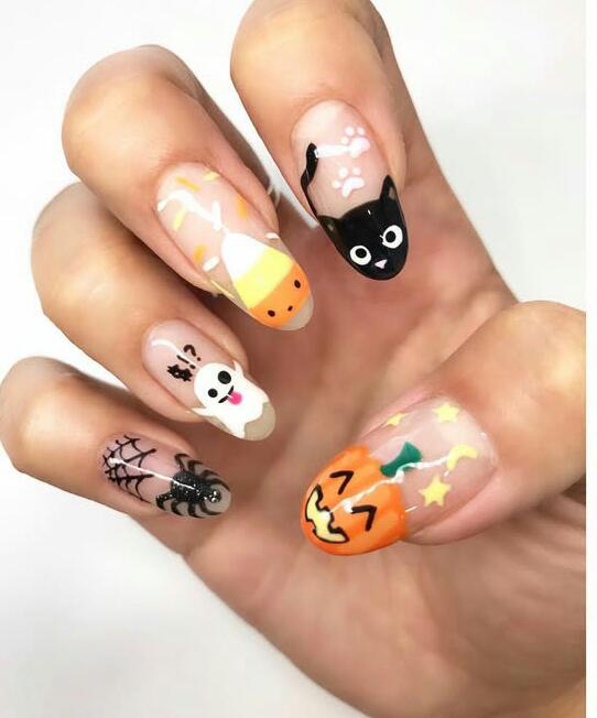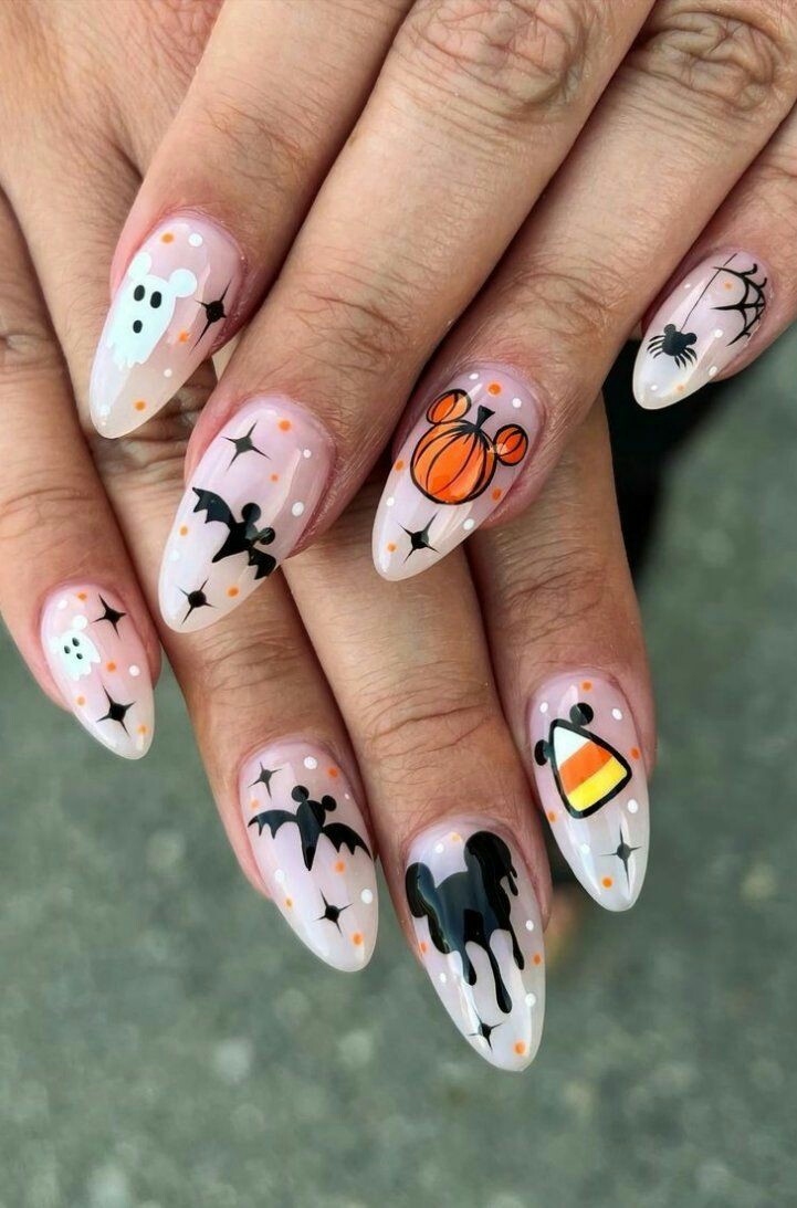 Clear nails with Halloween icons like bats, ghosts, pumpkins, and candy corn, blending festive and spooky in a subtle way.