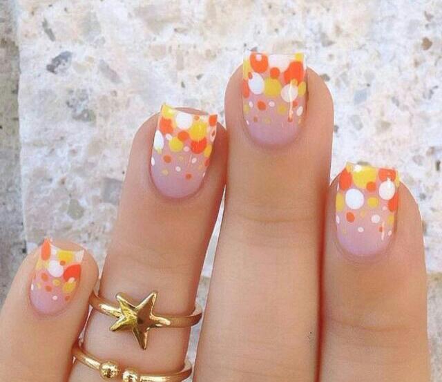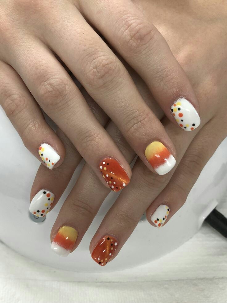 A playful mix of white, orange, and yellow fades paired with dotted accents, giving a fun candy corn vibe with a lighthearted twist.