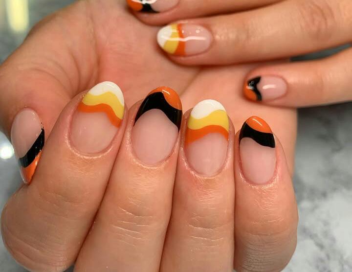 Modern swirls of candy corn colors along the tips, blending orange, yellow, white, and black in a sleek wave pattern.