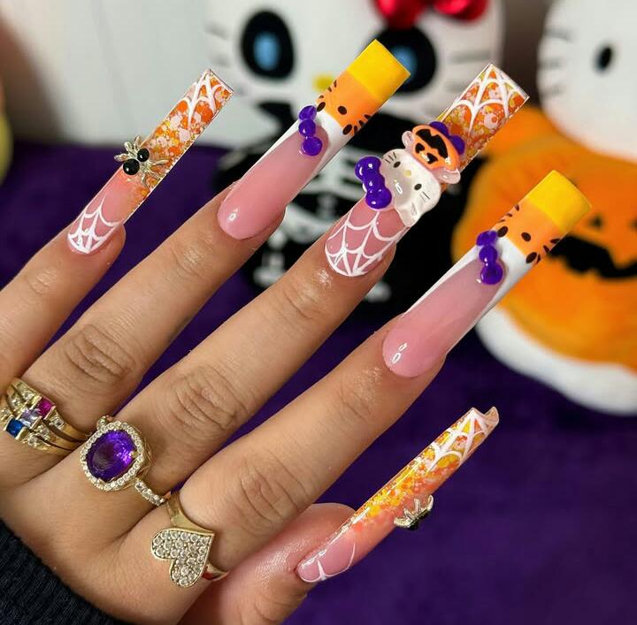 Bright candy corn fades mixed with jack-o’-lantern and spider web details, creating a fun and festive statement.