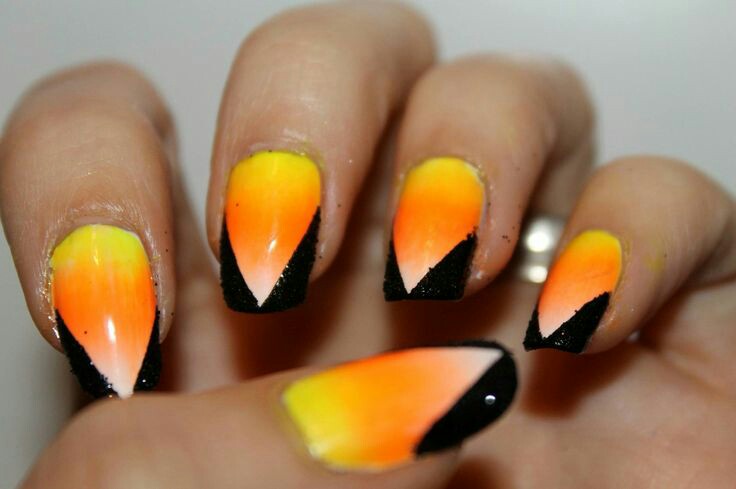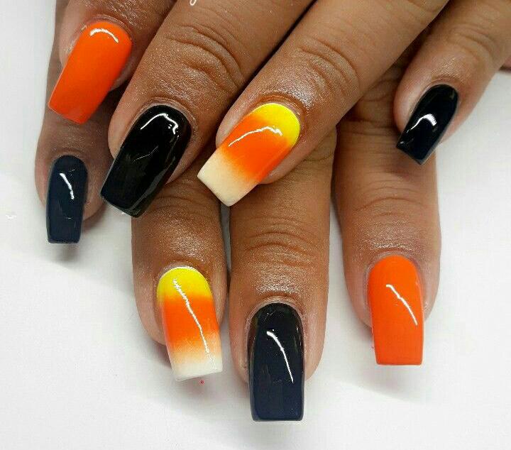 Candy corn ombré nails paired with matte black and glittery orange accents, balancing festive brightness with sleek sophistication.