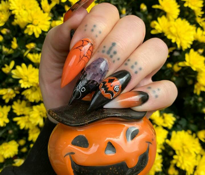 Long stiletto nails with webs, pumpkins, and candy corn gradients give off a dark, dramatic Halloween feel.